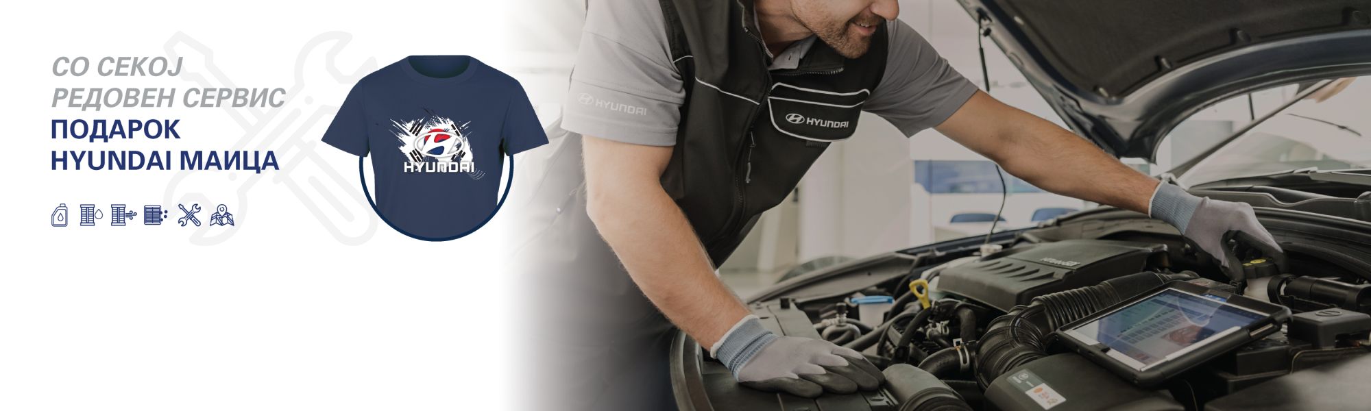 Закажете редовен сервис за вашето возило, и препуштете ги грижите на нашиот професионален тим. Воедно ќе добиете подарок брендирана Hyundai маичка.